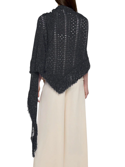 Simona Corsellini scialle in maglia traforata lurex con frange oro
