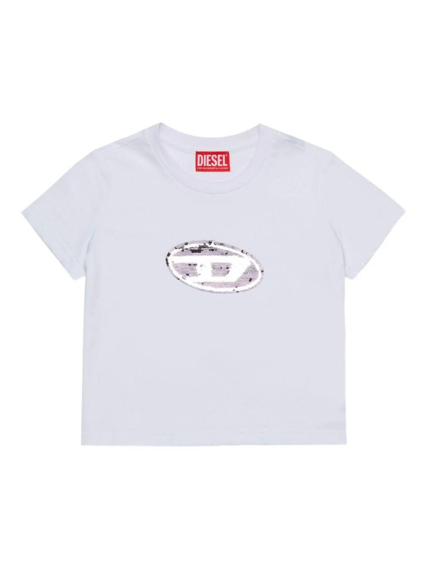 Il dettaglio che cattura l'attenzione è il logo iconico di Diesel, impreziosito da scintillanti paillettes bianche, che conferisce a questa T-shirt un tocco di brillantezza e originalità.