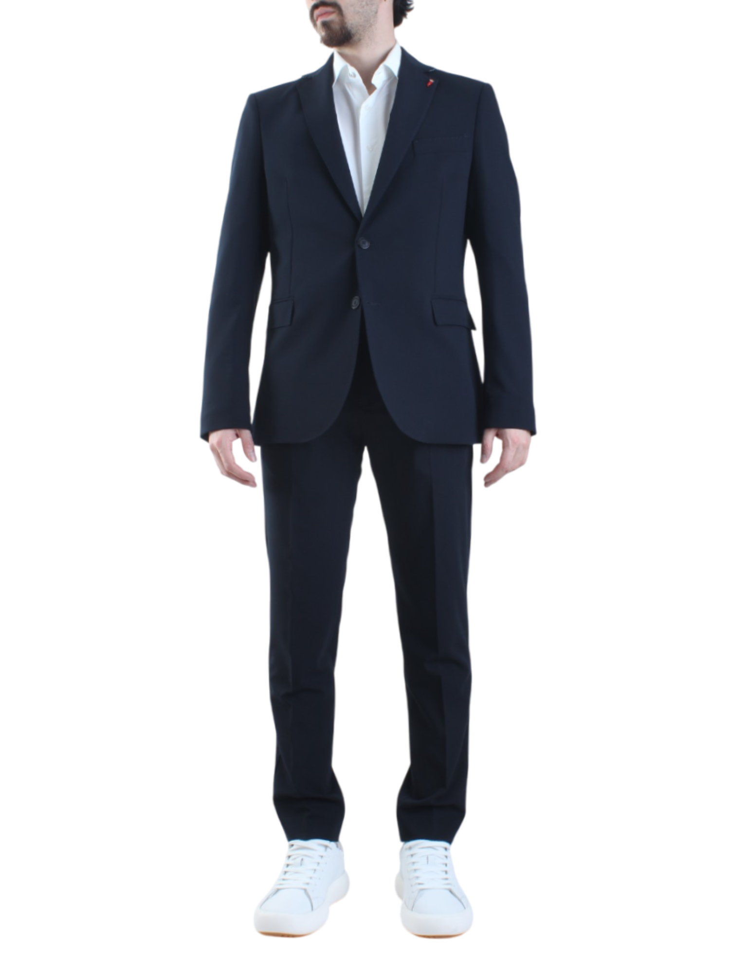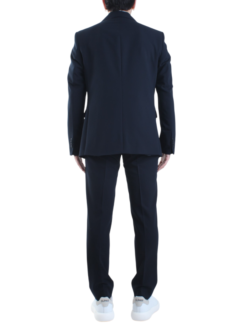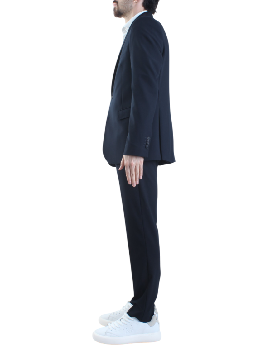 I pantaloni, caratterizzati da una gamba slim, sono completati da tasche sul davanti e tasche a filetto sul retro, mantenendo così un equilibrio perfetto tra eleganza e praticità. Questo abito, indossato dal modello nella taglia 48, sottolinea la vestibilità e la silhouette contemporanea.