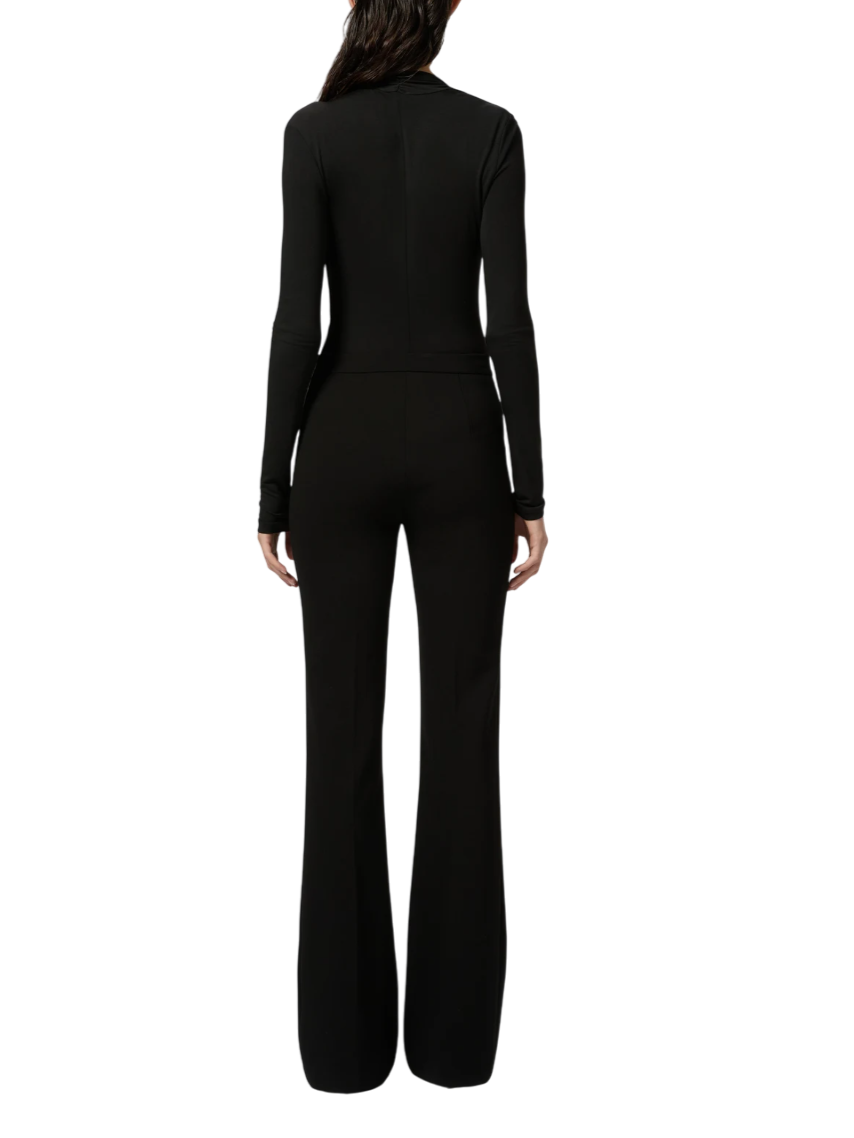 Caratterizzati da una vita alta, i pantaloni presentano una chiusura con zip e gancetti nascosti, assicurando un fit ordinato e raffinato. La loro silhouette flare abbraccia delicatamente la gamba fino al ginocchio, svasandosi elegantemente verso il fondo, creando un effetto allungato e slanciato.