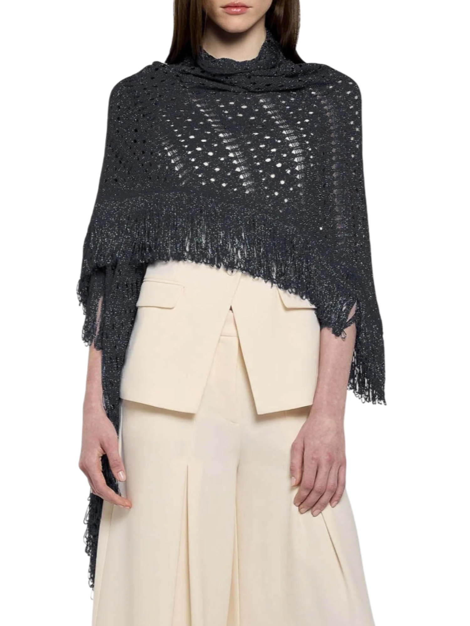 Simona Corsellini scialle traforato lurex con frange nero