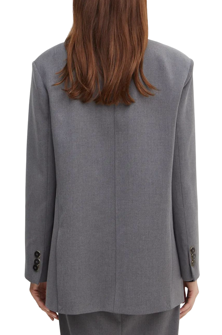 Caratterizzata da un'abbottonatura monopetto, presenta un collo con revers che conferisce un tocco sofisticato. Le spalline imbottite garantiscono una silhouette definita, mentre il taschino sul petto e le tasche a filetto sul davanti aggiungono funzionalità e un accento di classe.