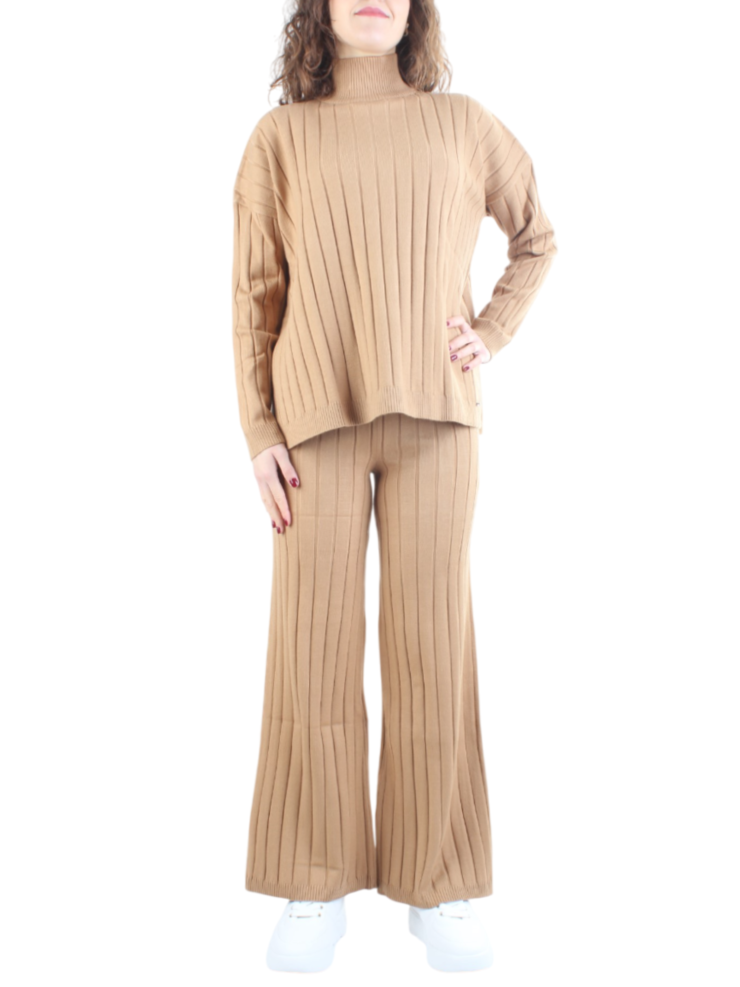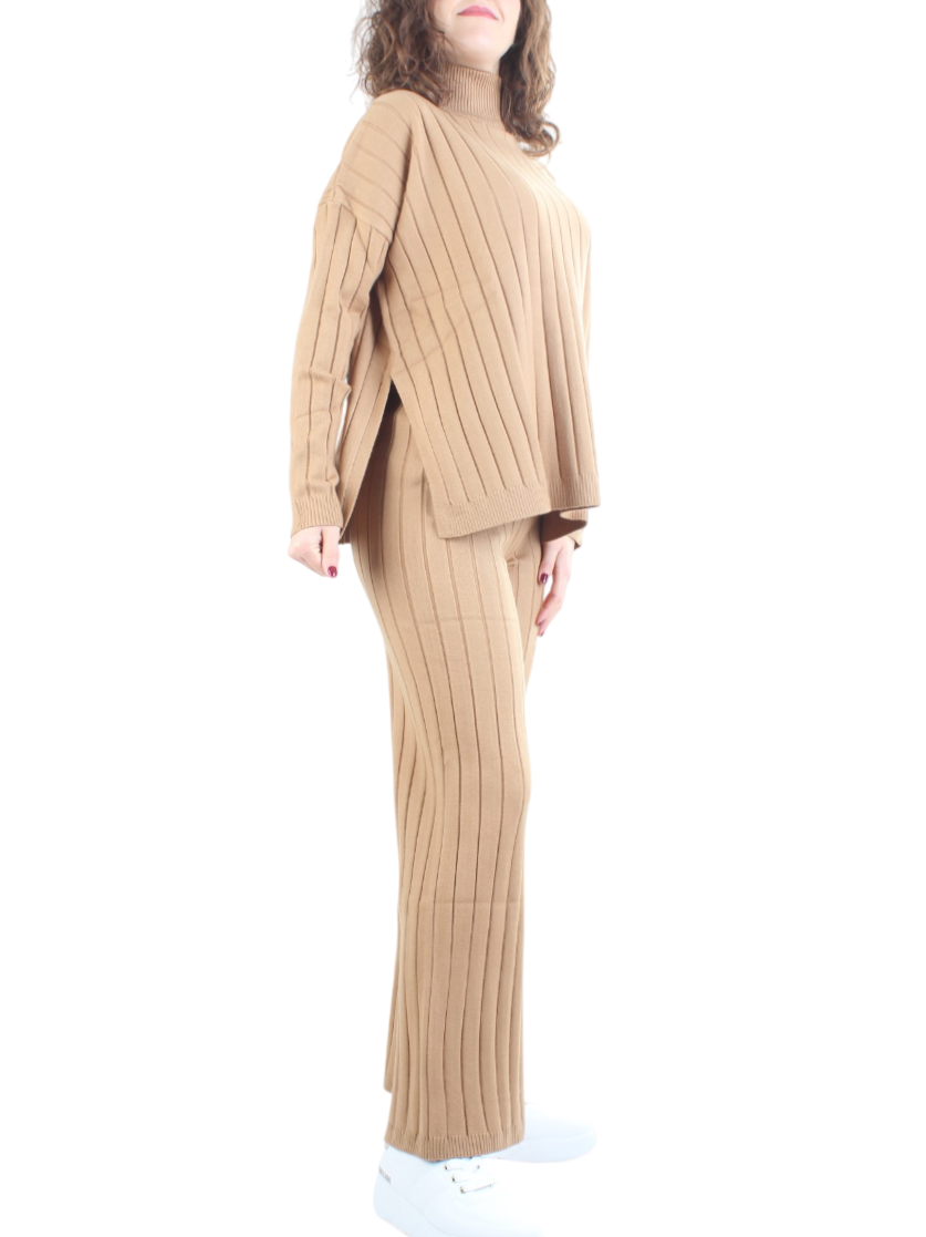 Questi materiali sono selezionati per garantire un'ottima vestibilità e una sensazione di benessere sulla pelle. Il colore cammello rende questo completo facilmente abbinabile e perfetto per diverse occasioni, dall'ufficio a una serata casual.