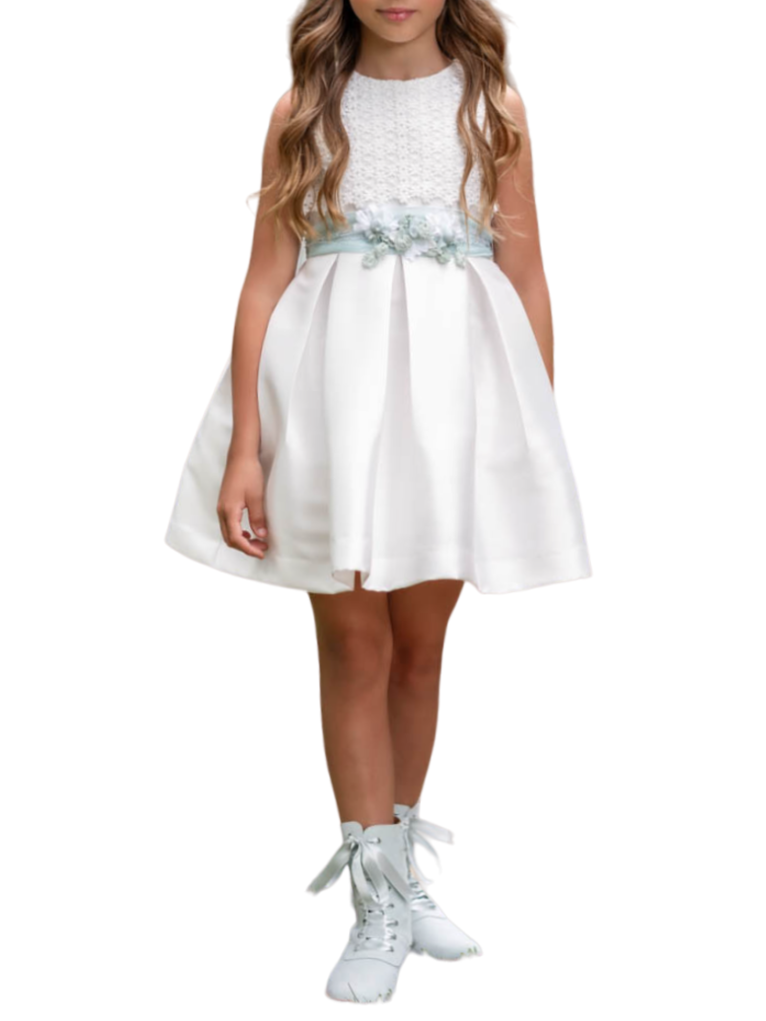 Il modello smanicato presenta uno scollo tondo, perfetto per esaltare la dolcezza della bimba. La chiusura con cerniera invisibile sulla schiena facilita l'indossamento, garantendo un comfort ottimale. Il corpino, interamente realizzato in pizzo con delicati ricami floreali, aggiunge un tocco di grazia e femminilità.