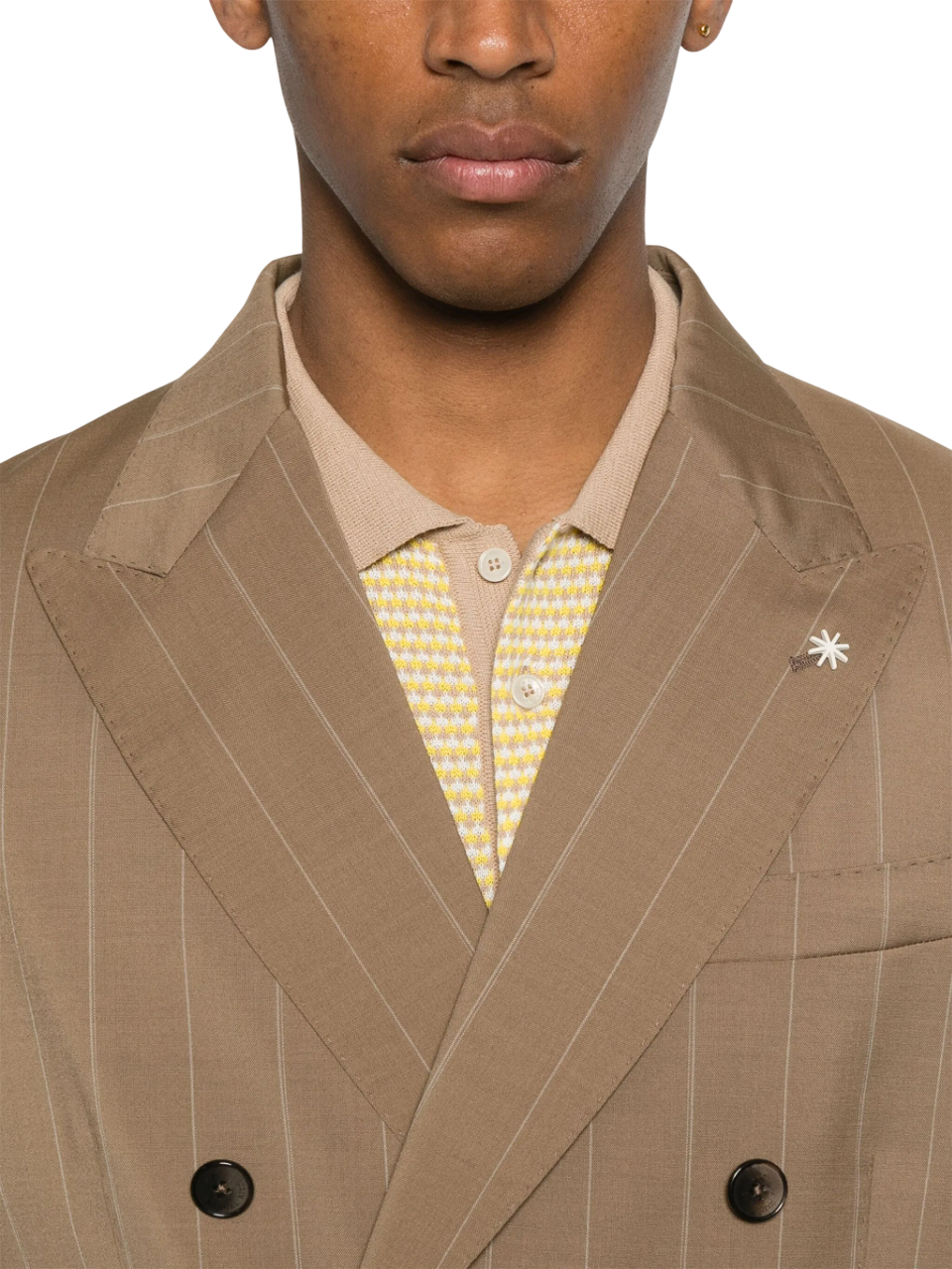 La giacca doppiopetto presenta un colletto con revers a lancia, un dettaglio che conferisce un tocco di classe e stile. Le tasche frontali e il taschino sul petto offrono praticità senza compromettere l'estetica del capo, mentre la spilla iconica applicata sul petto aggiunge un elemento distintivo e di grande carattere.