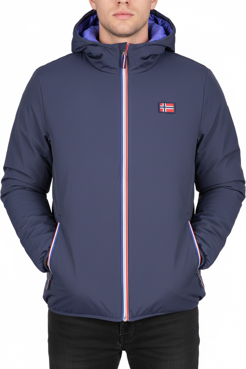 Scoprite il giubbotto a maniche lunghe con cappuccio di Norway 1963, un capo d'abbigliamento elegante e funzionale, perfetto per la stagione. Questo giubbotto reversibile in blu e blu royale offre versatilità e stile, permettendovi di adattare il vostro look alle diverse occasioni.