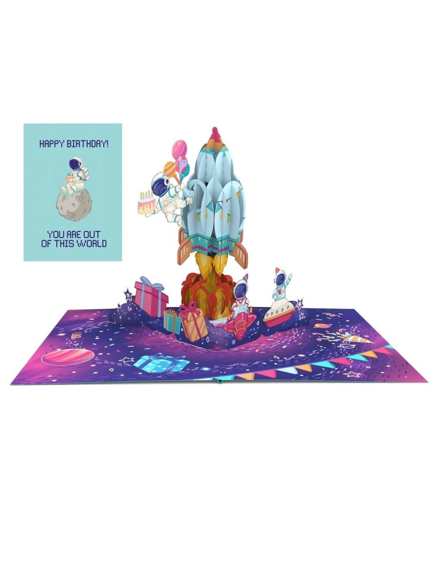 - Design pop-up sorprendente: All'apertura, il biglietto si trasforma in un vivace scenario spaziale, con elementi che sembrano prendere vita.